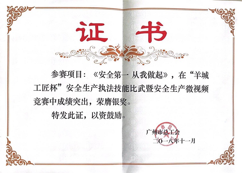 2018年11月29日下午,广州市总工会和广州市安全生产监督管理局联合在第一次全国劳动大会旧址举办2018年“羊城工匠杯”广州市安全生产系列竞赛表彰总结会。其中,2018年9月,在我司工会的大力支持下,我司安全保卫部创作,企业文化部、动力车间和检验中心等多部门协助拍摄的《安全第一,由我做起》荣获银奖。