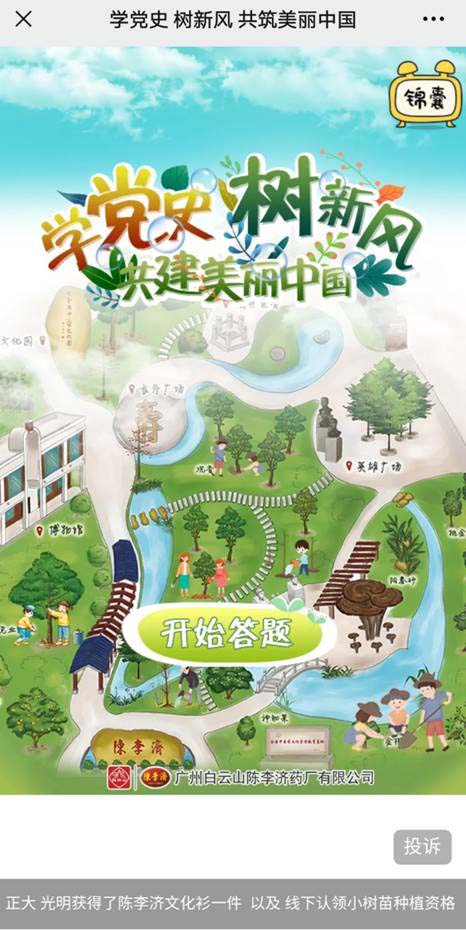 适逢一年一度的植树节,白云山陈李济团委在党委领导下组织公司党工团员在陈李济中药文化园园区内开展公益生态环保植树活动。活动分为两个阶段:第一部分是3月8日—3月10日线上党史知识挑战答题,过线上获取小树苗种植资格、线下在陈李济中药文化园栽种树苗活动形式,发动广大党工团青年参与线上党史知识挑战答题活动,答题满分后将获得认领小树苗的抽奖资格,共5名幸运儿可以获得小树苗认领种植资格以及陈李济文化衫一件。第二部分是2021年3月15日白云山陈李济党委书记董事长石洪超、党委副书记工会主席陈进伟、总经理孙东、纪委书记侯旭然、质量副总经理覃仁安、营销副总经理夏湘龙带领公司党工团员在陈李济中药文化园现场植栽种树苗,倡导广大党工团员要学党史、悟思想、办实事、开新局,爱护环境、守护家园,树立新风貌,携手共筑美丽中国。