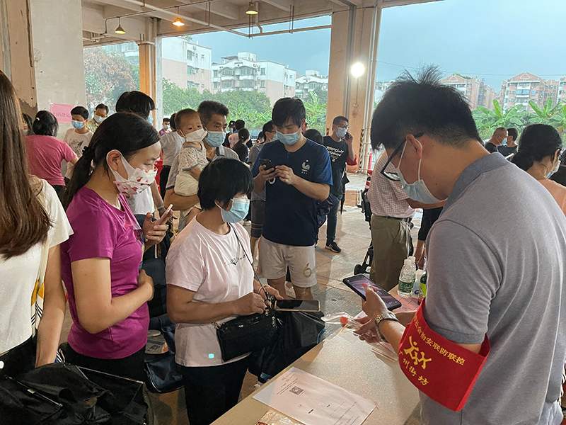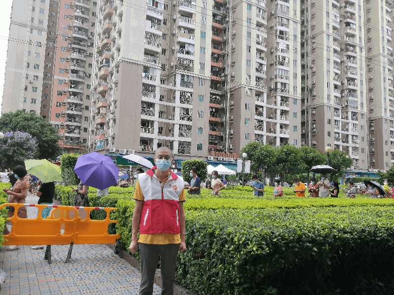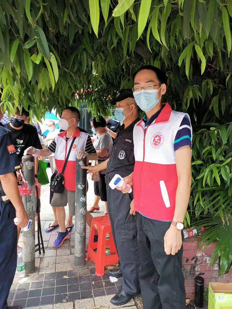 海珠区金碧社区规模大,人员密集。自南洲名苑出现疫情后,金碧社区一时间防疫压力陡增。第四党支部书记贺兵知情后,主动请缨做核酸检测志愿者。他耐心引导居民排队、维持现场秩序、登记录入信息、协助答疑解惑,全力配合社区检测点做好各类辅助性工作。在烈日高温下,在狂风暴雨中,一直坚守岗位,他说:“心有朝阳,未见雨雾烈日!志愿活动每天都是晴天”。