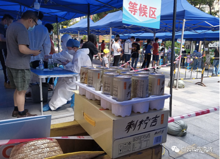 番禺区大石街的陶甜向工作人员送上消暑的扶贫产品刺柠吉饮料,向志愿者点赞,“向医护人员致敬,这是2021夏天最棒的合照!”