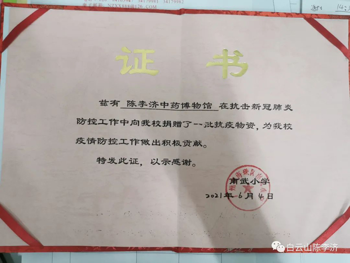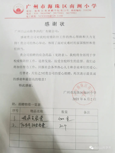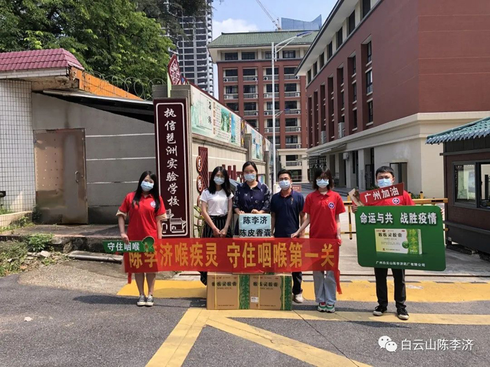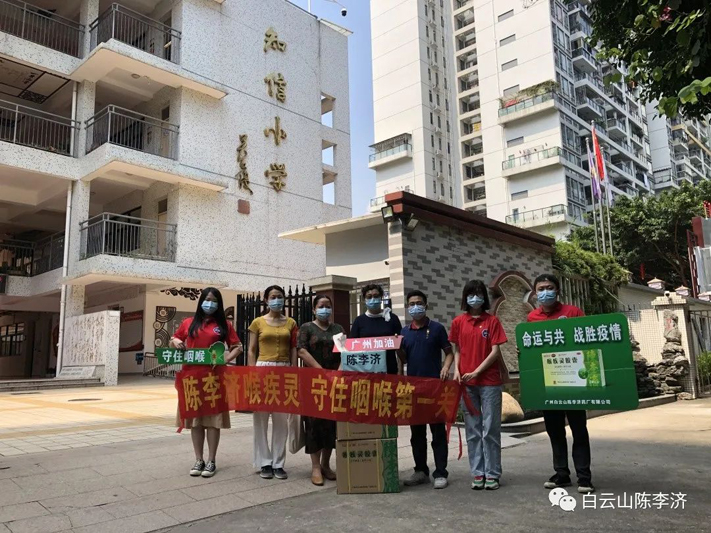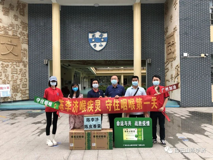 陈李济团委组织“广药白云山向秀丽雷锋陈李济志愿服务分队”开展志愿服务活动,为学校捐赠抗疫应急物资,志愿校园抗疫工作。于6月3号~6月7号向广州市海珠区南洲路小学、广州市海珠区南武小学、广州市海珠区执信琶洲实验学校、广州市海珠区知信小学捐赠喉疾灵胶囊、陈皮香囊、陈皮山楂条一批,助力学校继续开展疫情防控工作,命运与共,携手战胜疫情!