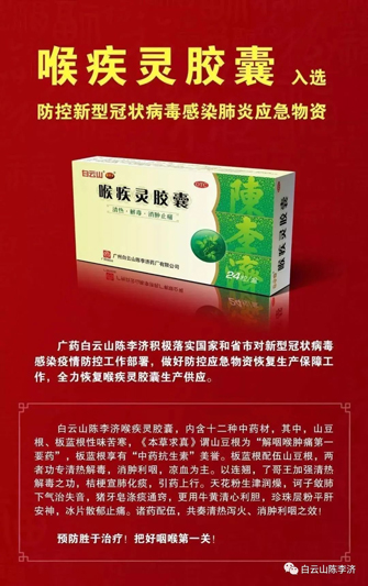 2020年1月24日,陈李济喉疾灵胶囊入选广州市防控新型冠状病毒感染肺炎应急物资。