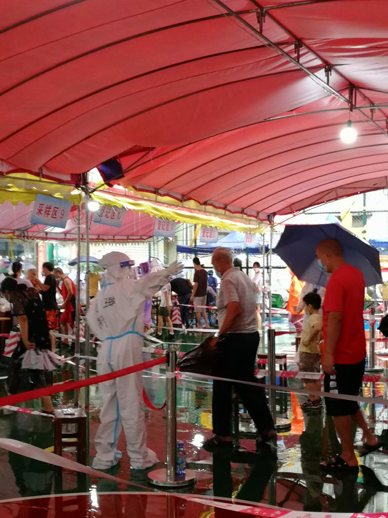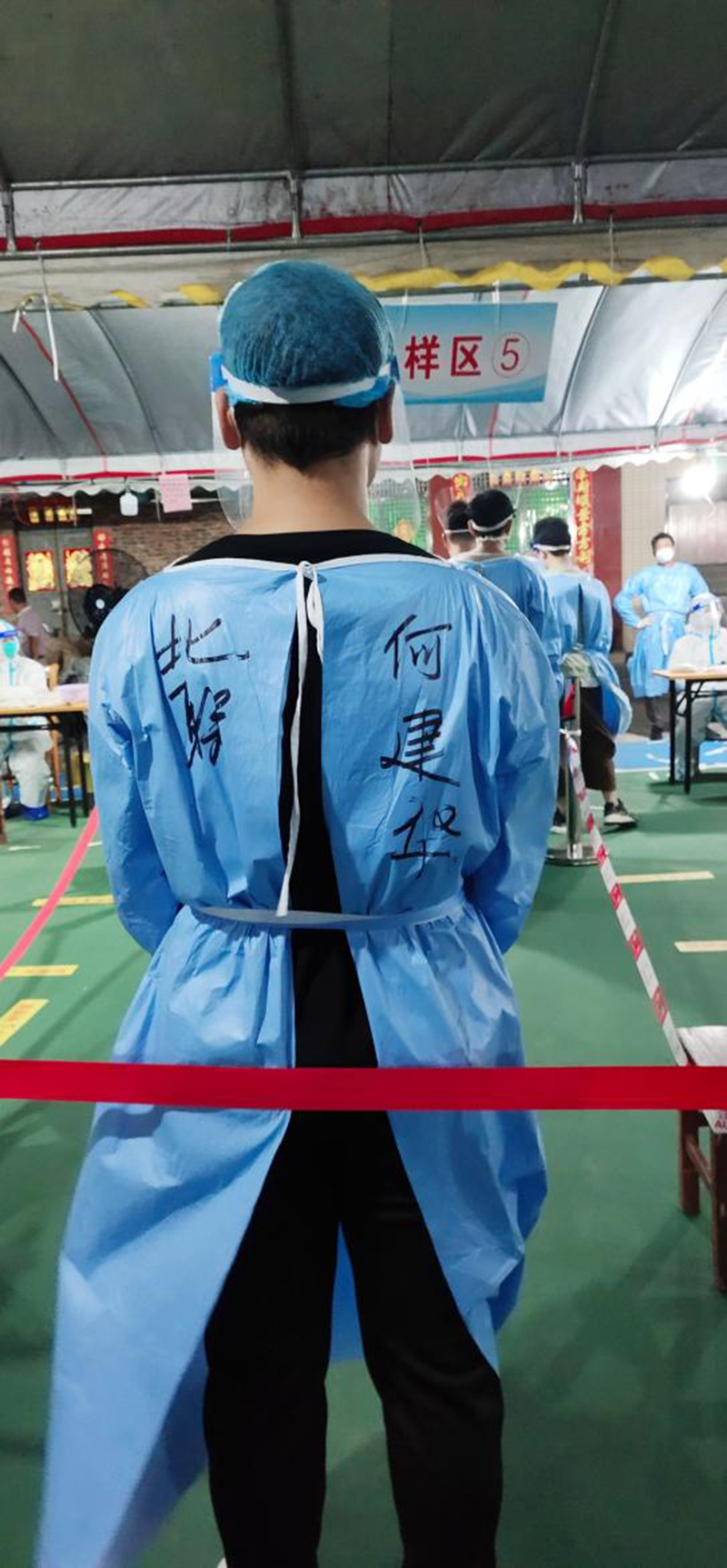 在北联村核酸检测维持秩序的现场,我们看到了一个美丽而熟悉的身影,她就是我们的入党积极分子王敏。当穿上防护服时那一瞬间,觉得防护服如千斤重一般,闷热感随之而来,汗如雨下,感觉自己的呼吸越来越吃力,但王敏内心的想法就是“忍”。经过4~6个小时的志愿服务,脱下防护服的她,内层衣物早已被汗水所浸湿,脱下手套,双手已经被汗水所泡白。虽然是累,但在工作期间,质朴的村民对她的工作竖起大拇指时,所有的疲惫和不适感都消失了。王敏说:“在这场战役中,我们都是战士,不管任何艰难险阻,我们都要勇往直前的战胜它。”