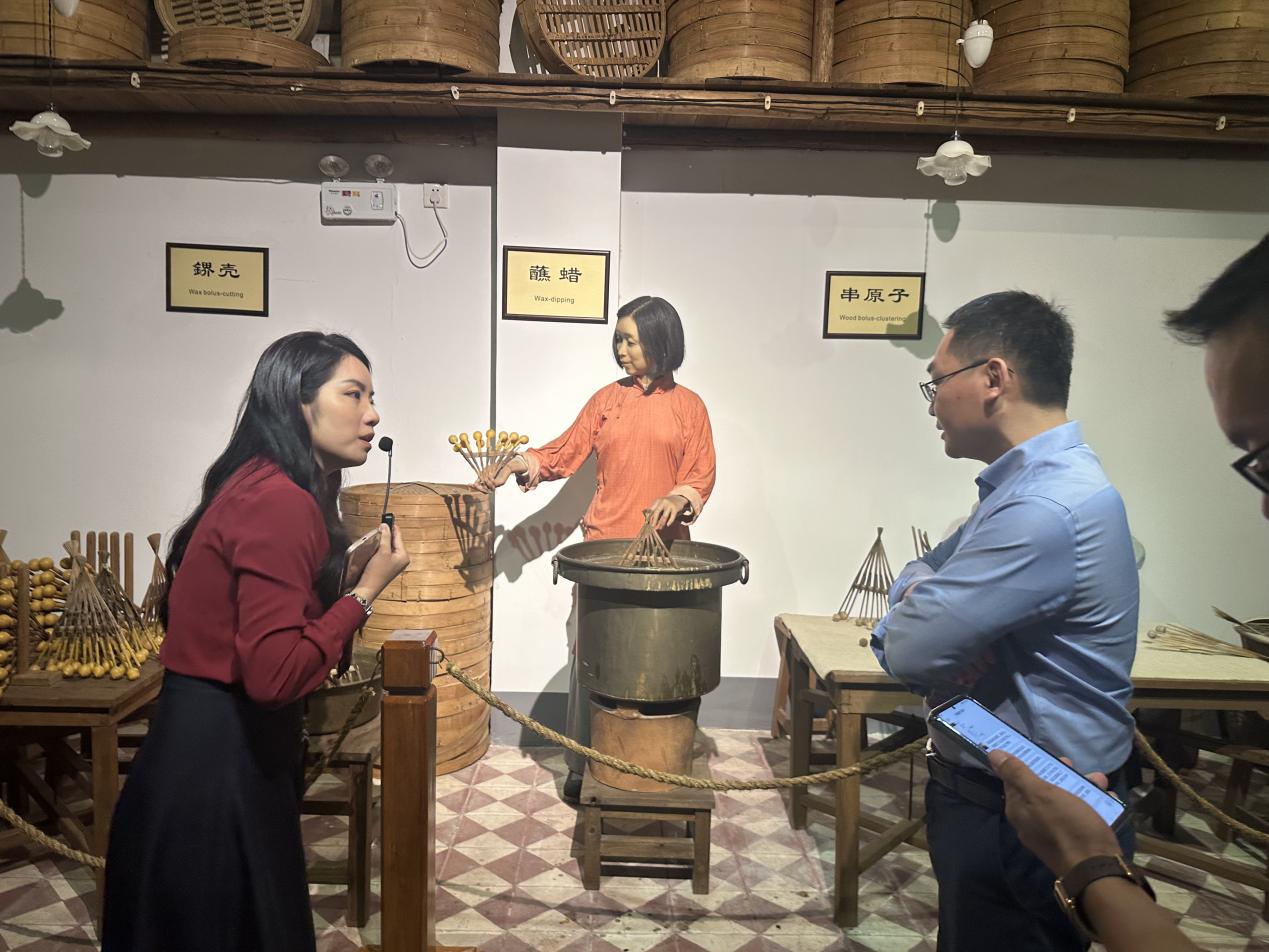 张永涛总经理为李治国教授介绍陈李济蜡壳工艺