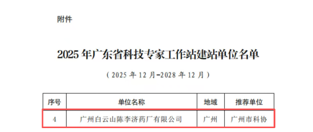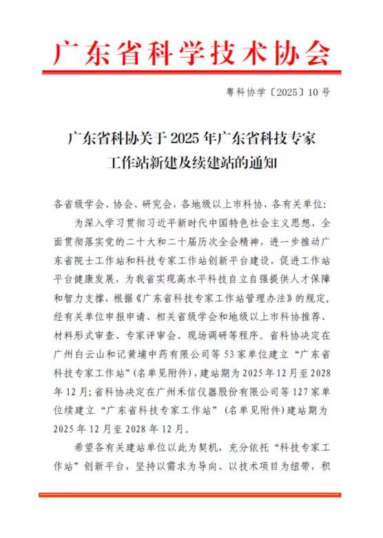 近日,广东省科协下发了《关于2025年广东省科技专家工作站新建及续建站的通知》,陈李济凭借突出的科技创新实力、扎实的产学研合作基础,成功获批设立“广东省科技专家工作站”(新建站),成为本批次全省53家获认定单位之一!这是公司践行创新驱动发展战略的重要里程碑,标志着我们在高层次人才引进、核心技术攻关和成果转化领域迈入全新阶段。