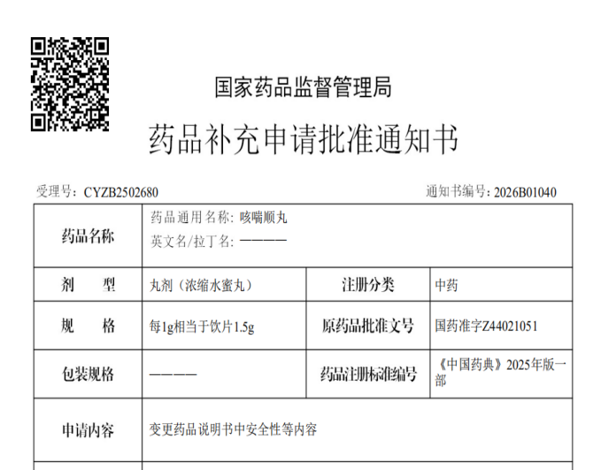 咳喘顺丸说明书安全性变更补充申请批准通知书
