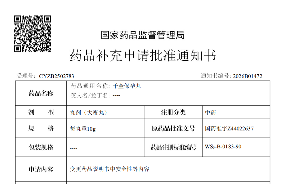 千金保孕丸说明书安全性变更补充申请批准通知书