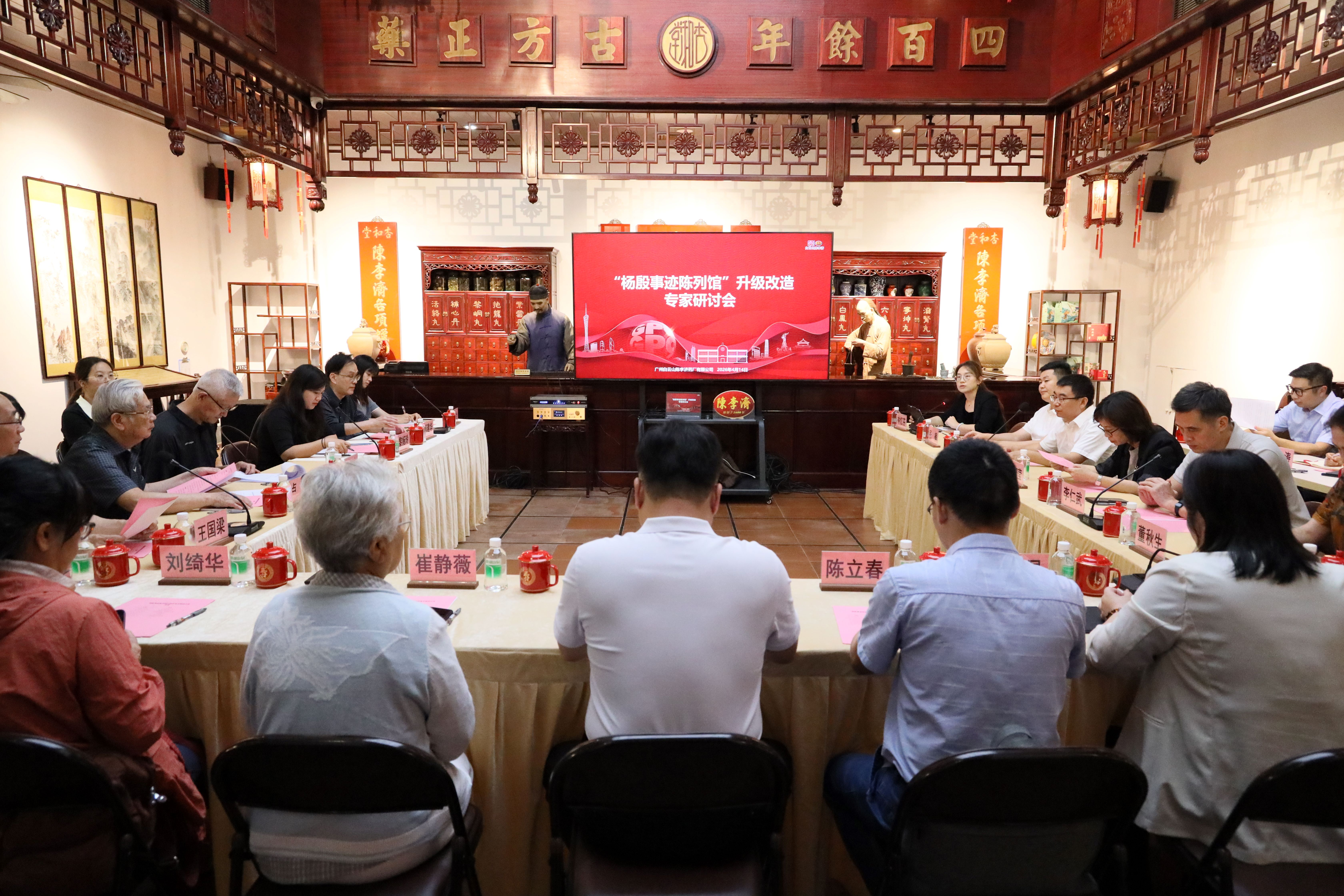 2026年4月14日下午,广州白云山陈李济药厂有限公司在陈李济中药博物馆正厅举行杨殷事迹陈列馆升级改造专家研讨会。本次研讨会以传承红色基因、提升展陈水平、赋能高质量发展为主题,特邀烈士后人、上级指导部门以及党史研究、博物馆展陈设计等领域专家齐聚一堂,共同研讨杨殷事迹陈列馆升级改造有关事项。