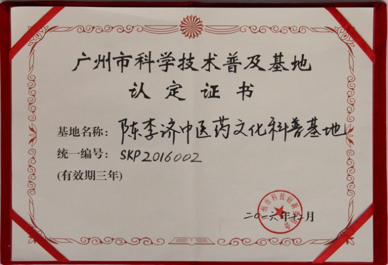 陈李济中医药文化科普基地已于2013年获得第六批“广州市科学技术普及基地”认定,按照《广州市科学技术普及条例》和《广州市科学技术普及基地认定办法》的要求,2016年期间,由广州市科技创新委员会组织专家组对各基地进行三年一次的考核。