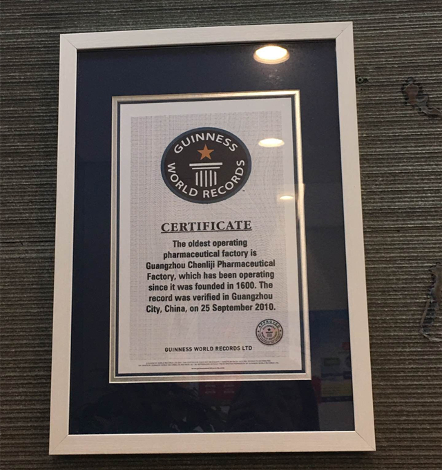 Guangzhou Chenliji Pharmaceutical Factory was verified as the oldest operating pharmaceutical factory by Guinness World Record on September 25, 2010.