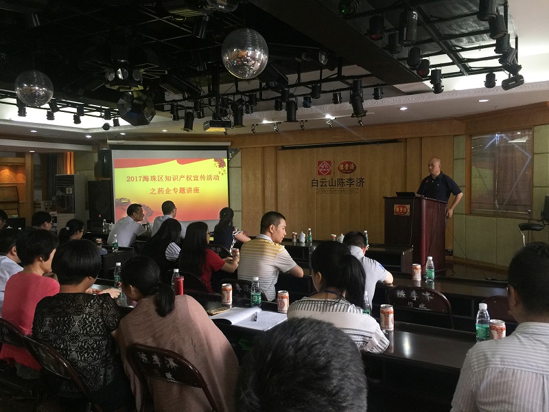 2017年6月6日下午,由海珠区知识产权局组织的知识产权宣传活动走进广州白云山陈李济药厂有限公司。本次活动是海珠区知识产权局送服务到企业的活动内容之一,吸引了海珠区药企积极响应和关注,来自白云山陈李济药厂、白云山明兴制药、白云山星群(药业)股份、白云山天心制药股份、白云山光华制药股份、白云山奇星药业、医药研究总院等公司近30名研发人员和管理人员参加了讲座活动。海珠区知识产权局副局长易凯、白云山陈李济药厂党委副书记陈进伟出席了讲座,易凯副局长作总结讲话。