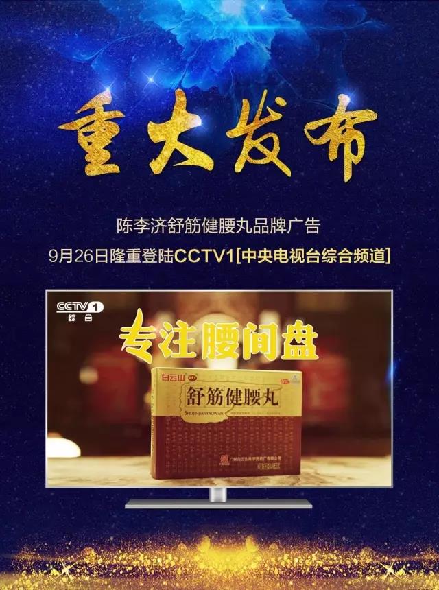 陈李济舒筋健腰丸乘势而上,锐不可当,自9月26日(今天)起,舒筋健腰丸品牌广告,隆重登陆CCTV1(中央电视台综合频道)晚间新闻。届时,陈李济舒筋健腰丸品牌广告将在中央电视台综合频道,晚间新闻时段(22:00-22:30)播出,展现国粹中药的风采。